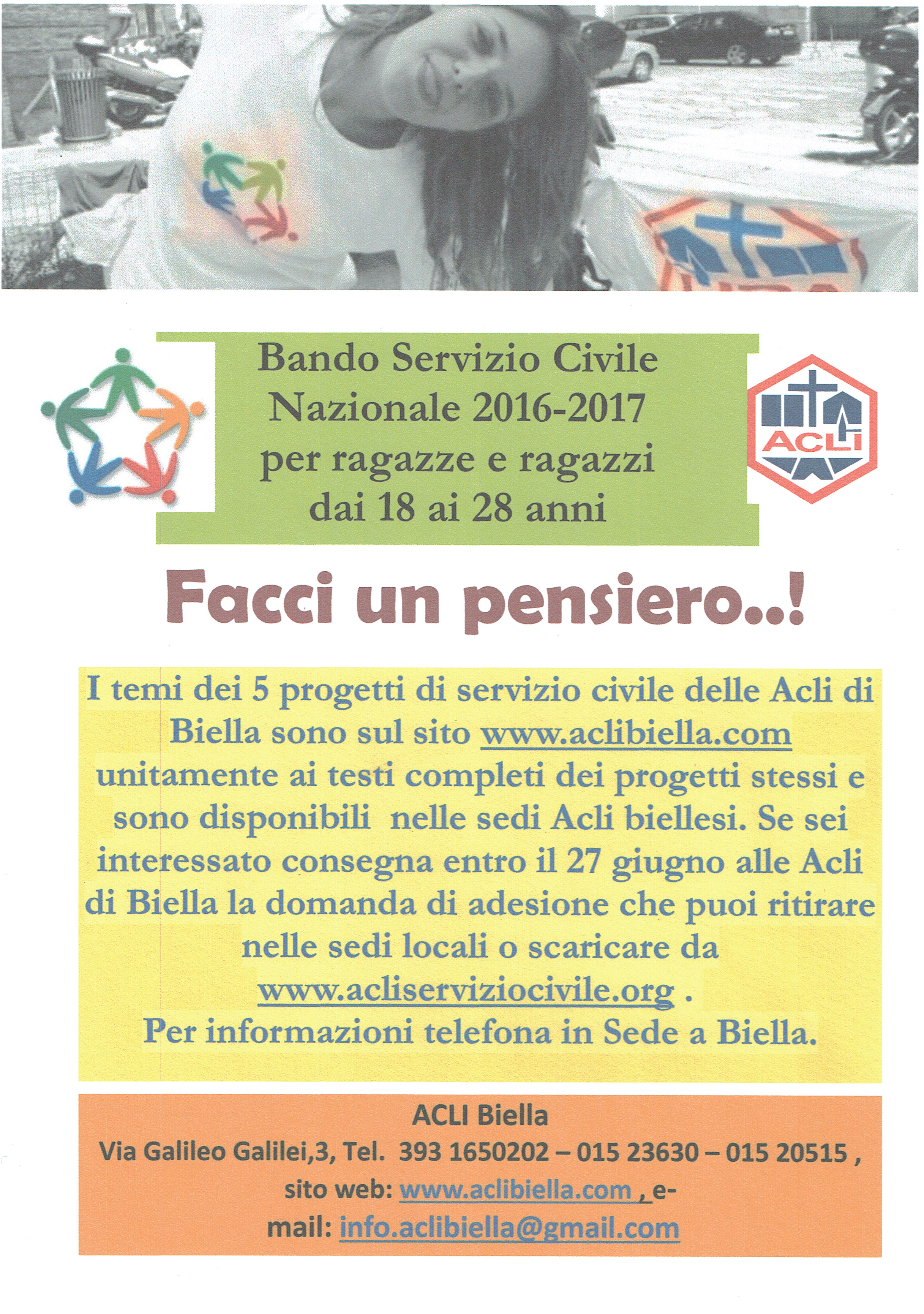 FACCI UN PENSIERO !!! I 5 progetti di servizio civile delle acli biellesi sono descritti in sintesi nella scheda allegata. Se sei interessata/to compila la domanda di ammissione e consegnala alle Acli di Biella in via Galilei,3 con la documentazione richiesta non oltre lunedì 27/6, inoltriamo noi a Roma. Questa domanda si può scaricare dal sito www.acliserviziocilile.org oppure ritirare presso le Acli. Per ogni eventuale chiarimento puoi contattare le Acli a