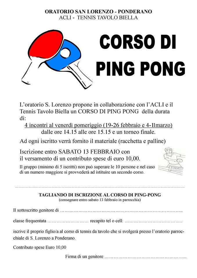 Signore e signori... sono ufficialmente aperte le iscrizioni per le lezioni di ping pong! L'Ass. Tennis-tavolo Biella, a suon di racchettate, vi insegnerà a diventare dei bravi giocatori. Al mare, nelle tavernette, nelle sale giochi... tutti temeranno il confronto con voi una volta finito questo mini corso! In conclusione, si organizzerà anche un piccolo torneo. Cosa aspettate?