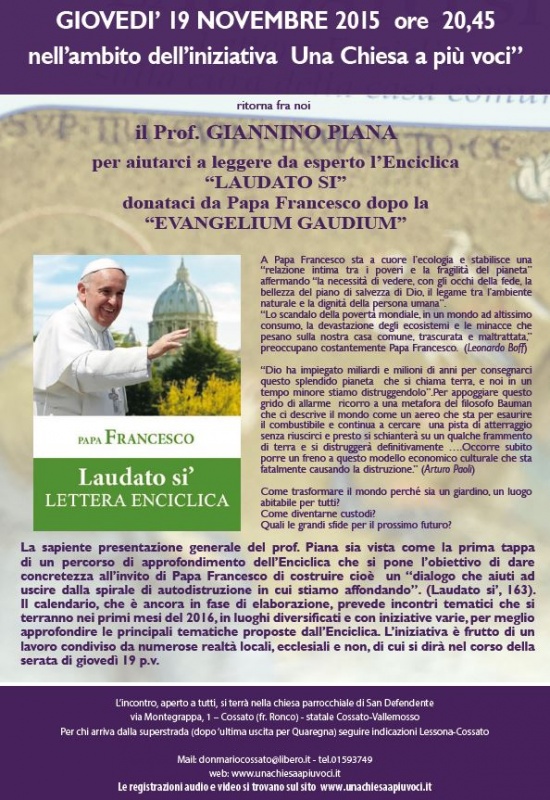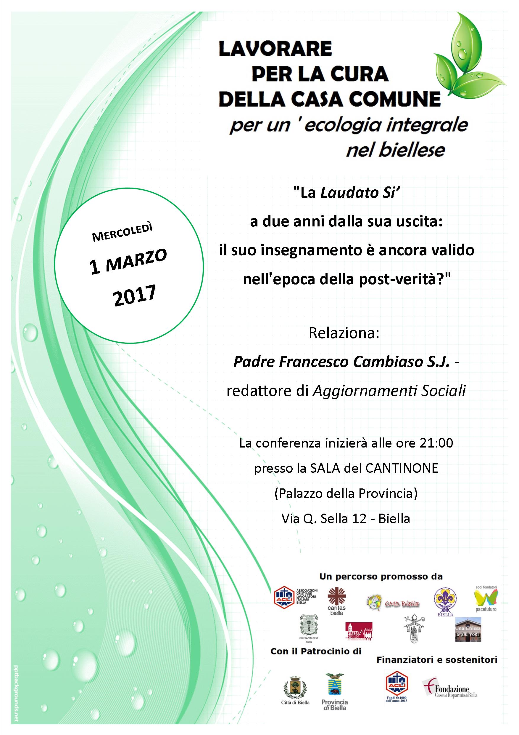 Cara amica, caro amico, gentile signora, egregio signore,la invitiamo a partecipare al primo incontro con Padre Cambiaso di mercoledì 1 marzo sul tema " Laudato si: il suo insegnamento è ancora valido nell'epoca della post-verità?" che inizia il percorso di approfondimento 2017 sulla Laudato si, da noi promosso unitamente a numerose associazioni. In allegato il pieghevole con i cinque incontri di questa seconda fase dell'iniziativa e i link dei filmati degli incontri della prima parte del percorso del 2016. Incontro aslle 21 alla Sala del Cantinone, Provincia di Biella. Ringraziando per la collaborazione che vorrà darci nel diffondere questo invito, cordialmente.