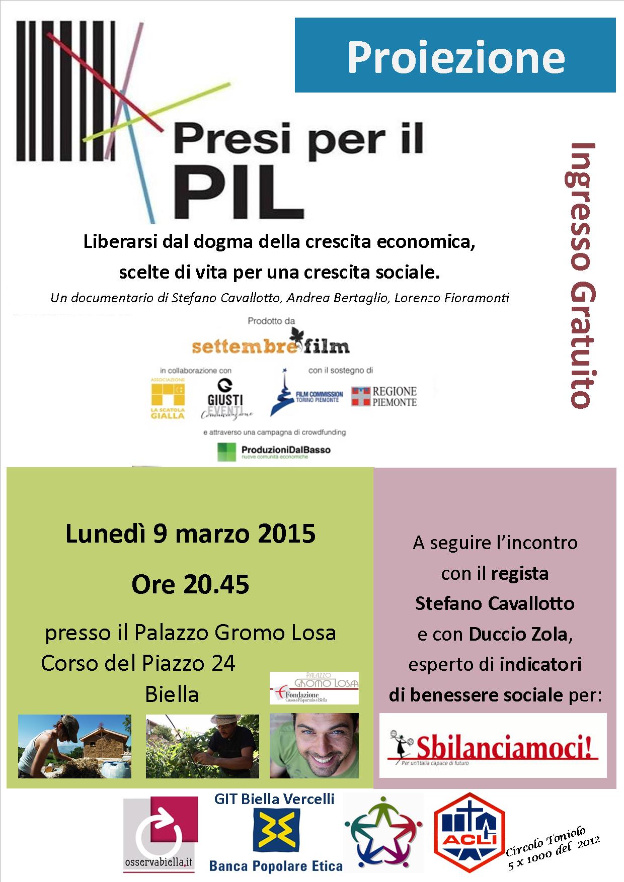 La Proiezione del film documentario "Presi per il PIL" (S. Cavallotto, A. Bertaglio e L. Fioramonti) approda anche a Biella, a Palazzo Gromo Losa (Piazzo) il 9 marzo alle 20,45. Durante la serata saranno presenti anche il regista Stefano Cavallotto, che racconterà da cosa è nata l'idea di girare il film, e Duccio Zola, esperto di indicatori di benessere sociale per Lunaria (una delle 48 organizzazioni della società civile che sostengono la campagna nazionale "Sbilanciamoci!").